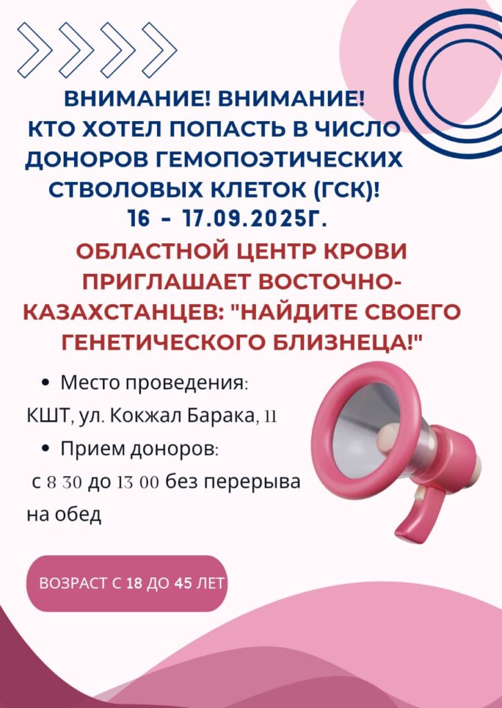 16-17 сентября областной центр крови приглашает Восточно-казахстанцев 《Найдите своего генетического близнеца!》, чтобы вступить в ряды доноров гемопоэтических стволовых клеток (далее — ГСК) и пополнить Национальный регистр костного мозга @registry_ KZ новыми донорами.